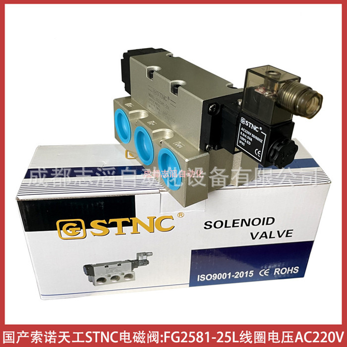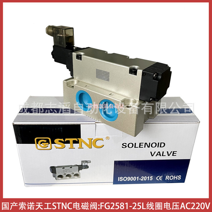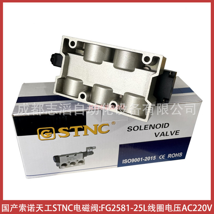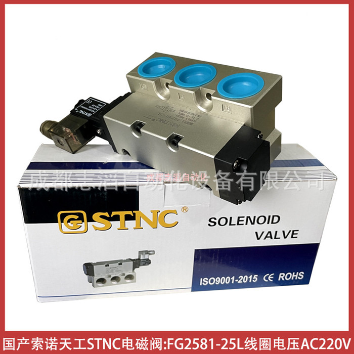 FG2581-25L线圈电压AC220V国产索诺天工STNC电磁阀-气动控制元件技术参数简介:功能2位5通、安装方式底座、驱动方式电控/气复位、工作压力1.5-9bar、介质压缩空气、线圈电压AC220V、防护等级IP65、环境温度:-5℃至60℃、产地中国宁波、货期1周