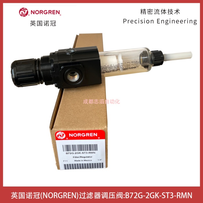 B72G-2GK-ST3-RMN英国诺冠过滤器调压阀NORGREN气源处理器技术简介:气口尺寸为G1/4、流量为49立方分米/s、无护套透明杯、重量0.650kg、过滤精度为40um、出口压力调节范围为0.3-10bar、不带压力表、膜片为溢流式!